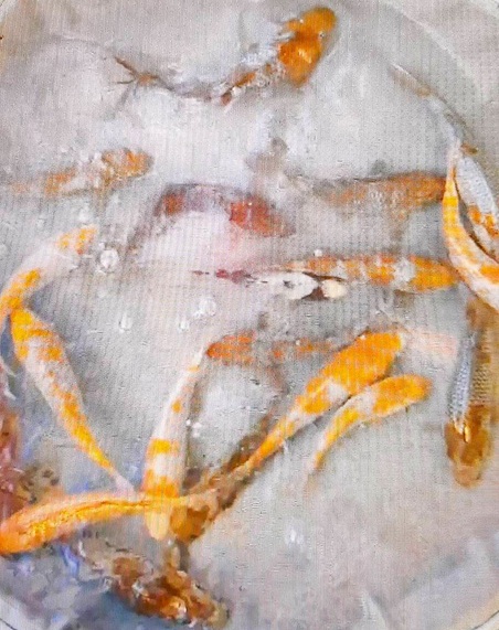 会場は一品家駐車場、黄葉・落ち葉・など変わり鯉800尾を販売